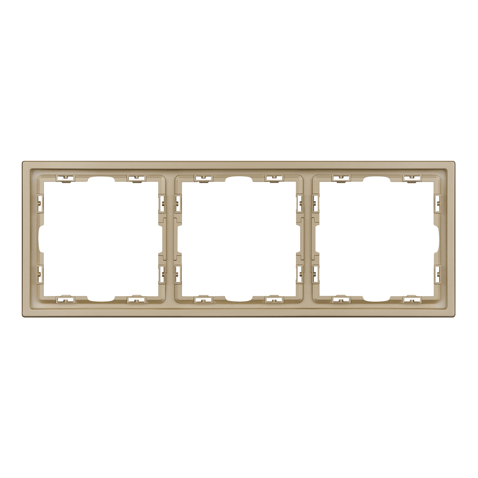 Рамка пластиковая на 3 поста, под встраиваемый механизм. Цвет - золотой, с Soft-Touch покрытием. Среднего уровня герметичности IP20. Ориентация монтажа горизонтальная.
